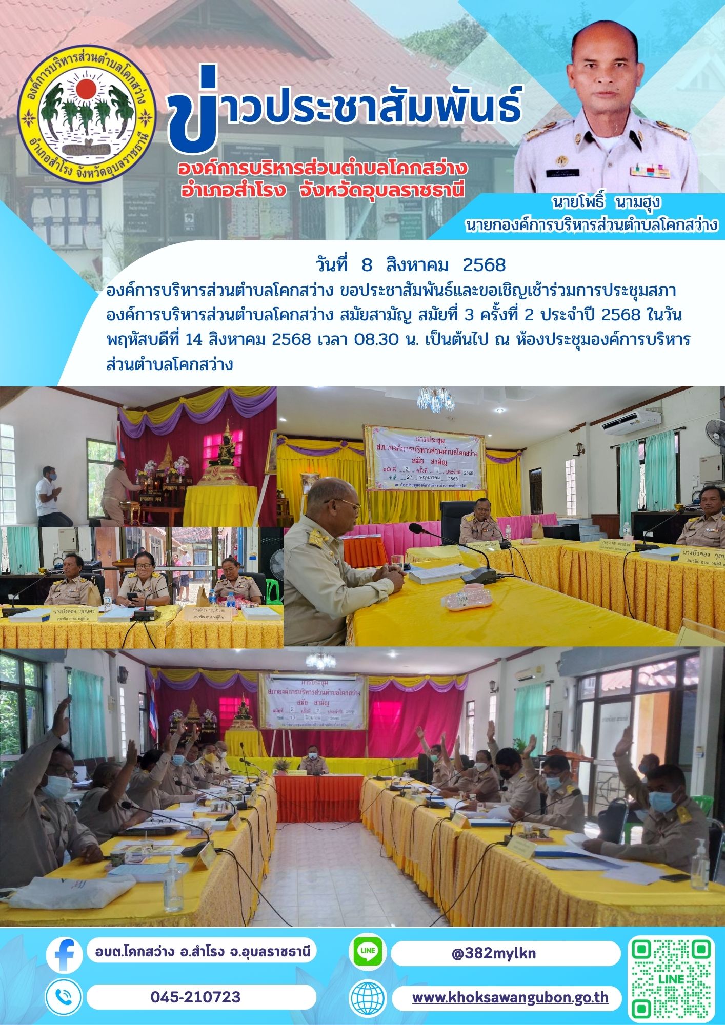 องค์การบริหารส่วนตำบลโคกสว่าง ขอประชาสัมพันธ์และขอเชิญเข้ารับฟังการประชุมสภาองค์การบริหารส่วนตำบลโคกสว่าง สมัยสามัญ สมัยที่ 3 ครั้งที่ 2 ในวันที่ 14 สิงหาคม 2568 ตั้งแต่เวลา 08.30 น. เป็นต้นไป ณ ห้องประชุมองค์การบริหารส่วนตำบลโคกสว่าง