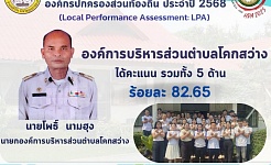 ผลการประเมินประสิทธิภาพของ องค์กรปกครองส่วนท้องถื่น ประจำปี 2568 องค์การบริหารส่วนตำบลโคกสว่าง ได้คะแนนรวมทั้ง 5 ด้าน ร้อยละ 82.65